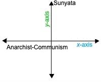While it is useful, Hakugen’s two-dimensional view of freedom is still rather vague about its details: do the two lines have some sort of coordinate system of greater and lesser freedoms? Does one approach greater freedom the farther one gets from the origin, or the closer? After pondering the idea for a while, I feel that it is probably better to not look to the metaphor for such precise answers. For Hakugen it seems that the graph was less of a prescriptive or descriptive metaphor, and more a representation of his own struggle, and the struggle of each person, as a political and spiritual militant, to realize the two sorts of freedom in their life. Rather than feeling pulled every which way by his interests and difficulties, or to definitively overcome either dimension, Hakugen sought to inhabit a standpoint at the origin of the two struggles towards freedom, striving to infuse all his actions with the qualities of each. The struggle to practice from this intersection is something which Hakugen referred to as “origin humanism” or “origin radicalism”. While he associated the vertical axis with freedom in sunyata, it is perhaps the origin, with the coordinates (0, 0), which best captures the heart of sunya-anarchist praxis, a centerless center at the fecund, developmental intersection of self and society and the “three worlds” of past, present, and future.