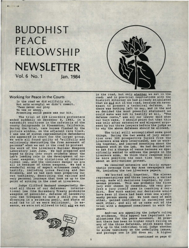 The BPF Newsletter Vol 6, No 1, Jan, 1984 had a brief letter from the Rochester BPF chapter, which was, “taking on the resource project which aims to produce a collection of previously published but hard to find articles on the Buddhist rationale for peace and environmental work, right living, anarchism, deep ecology, nonviolence, and such movements as Sarvodaya.”